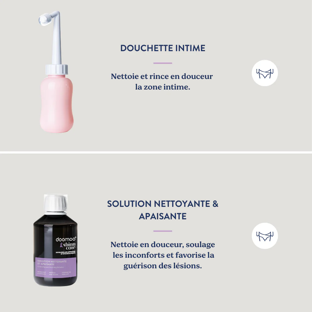 The Postpartum Care Duo is an essential kit for new mothers, designed to provide comfort, hygiene, and gentle care after childbirth. Developed in collaboration with Shinncare, a Belgian expert in intimate care, this duo combines two complementary products.